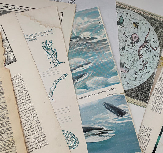 UNDER THE SEA: 1/8 lb mix of vintage fish & related book pages and papers for art, collage, junk journal, scrapbook, craft
