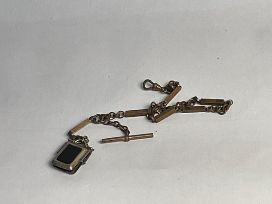 Victorian brass chunky pocket watch chain w tiny metal/glass photo-ready fob