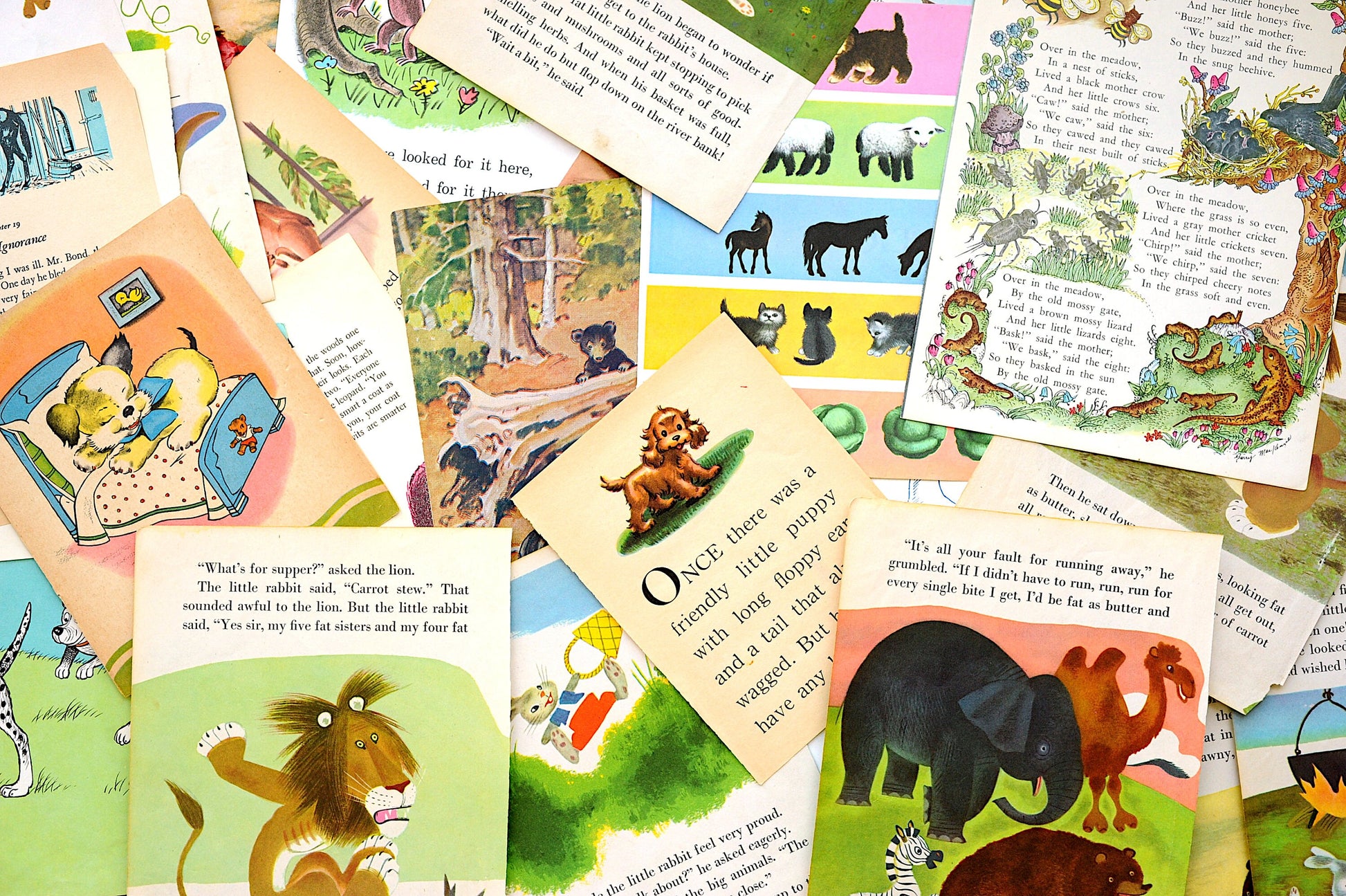 When you choose this item, one of our artists will hand-select 1/8 pound of vintage children’s book pages featuring animal illustrations. Perfect for collage art, junk journals, scrapbooking, or framing individual pages. Item count will vary (typically 10-15 pages), photos are roughly representative, and no two batches are alike.