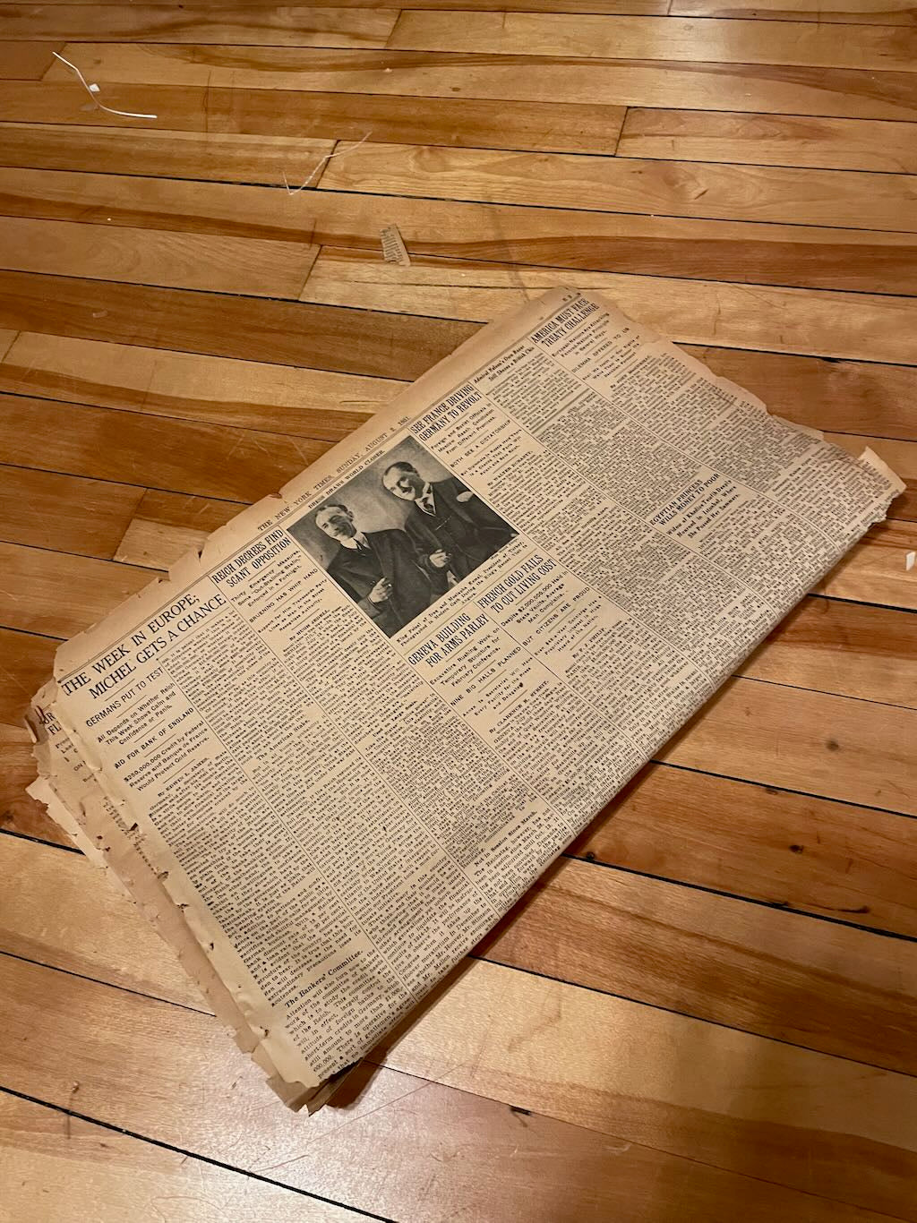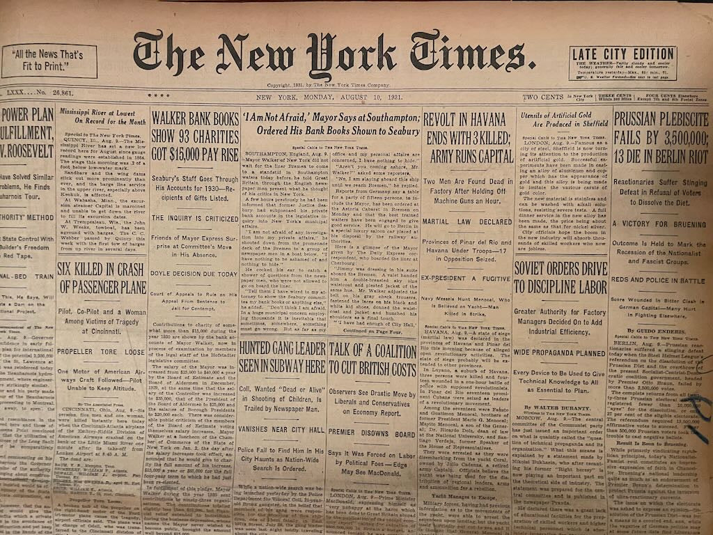 Two ounces of original newsprint from an August, 1931 issue of the New York Times. The pages feature text, images, and advertisements. These pages are tanned, delicate, and crispy at the edges: ideal for creative uses, history projects, paper layer, and more.