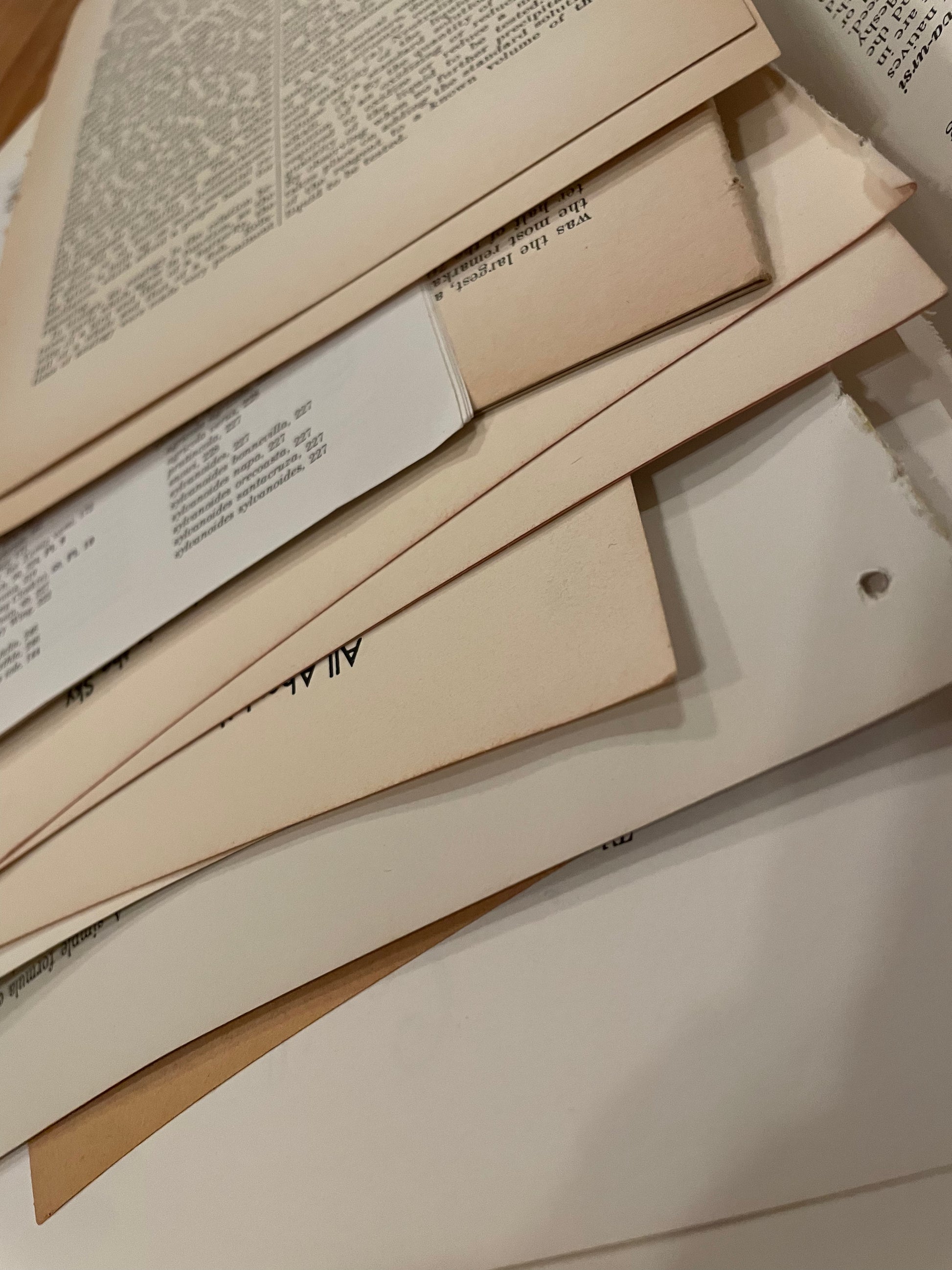 One half pound of absorbent, matte book pages with text for sculpture, piñatas, surface repair, and whatever else makes sense to you. Photos are representative, no two orders are alike.
