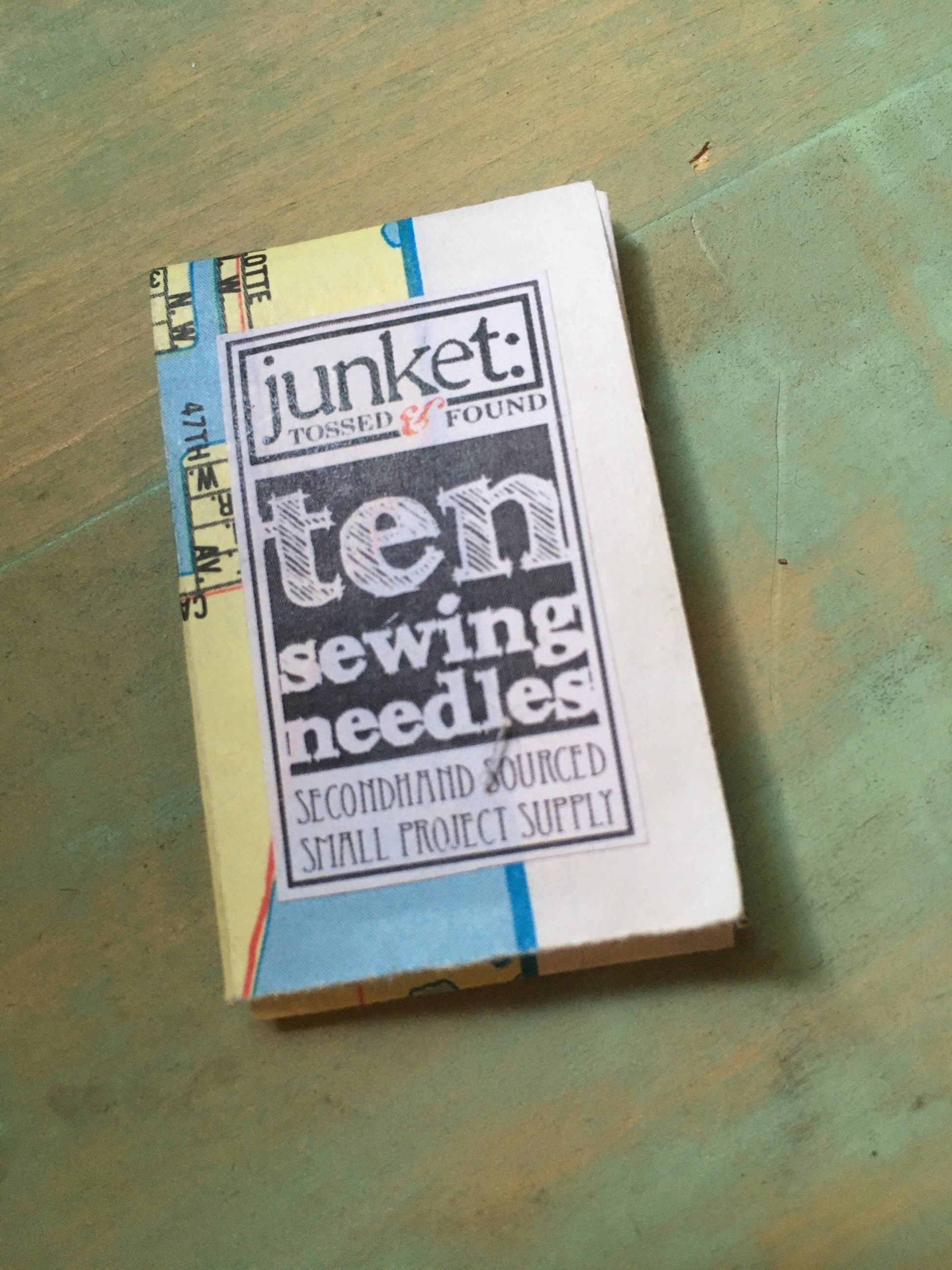 When you purchase this item, we'll send you a sweet little paper packet made out of an old book page or map, with ten sewing needles tucked inside - the needles will be various sizes, intended to get you through mends and projects when you need them.