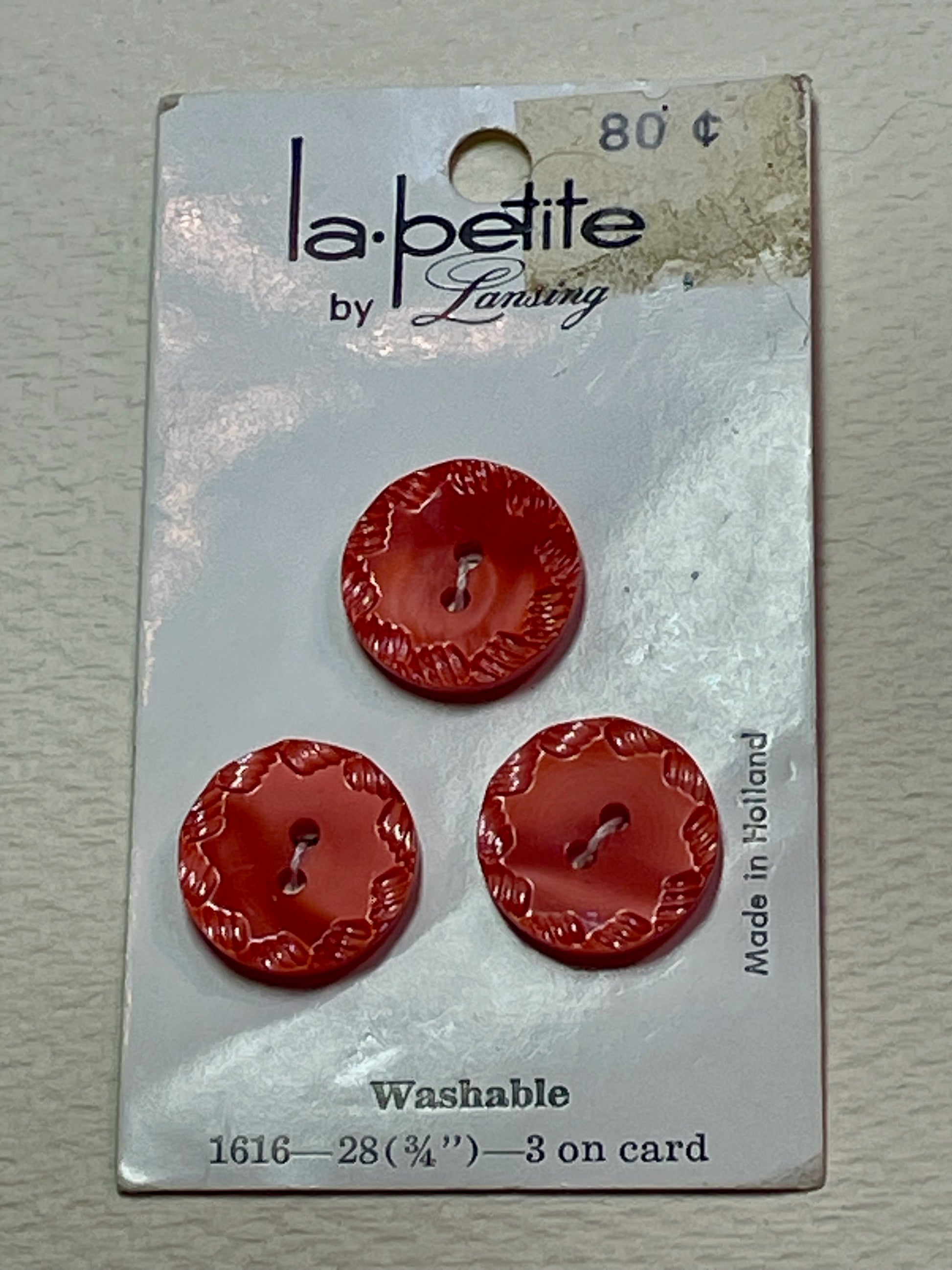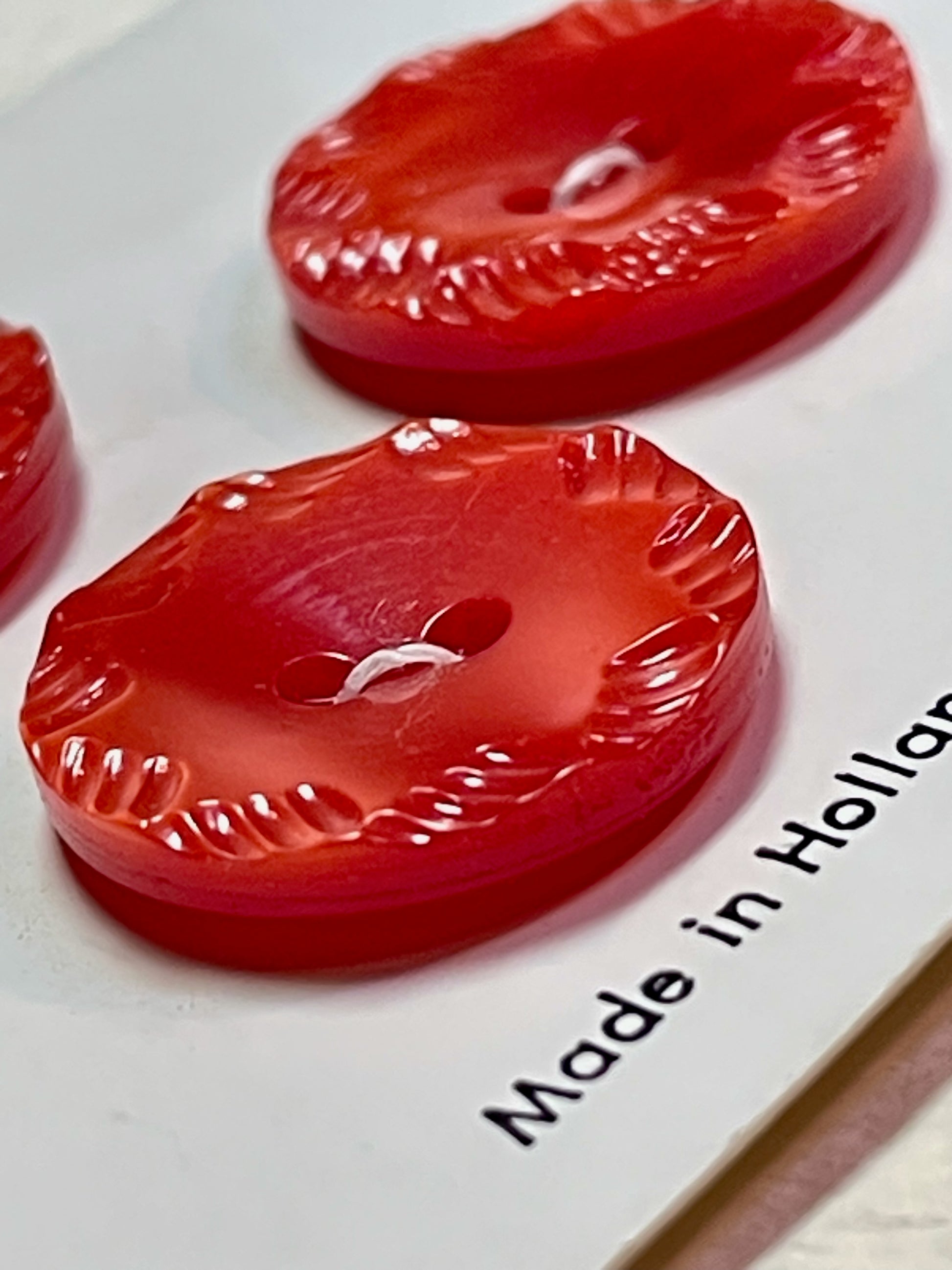 3 red vtg plastic buttons | 2 hole flat | size 30/0.75" | new old stock | made in Holland