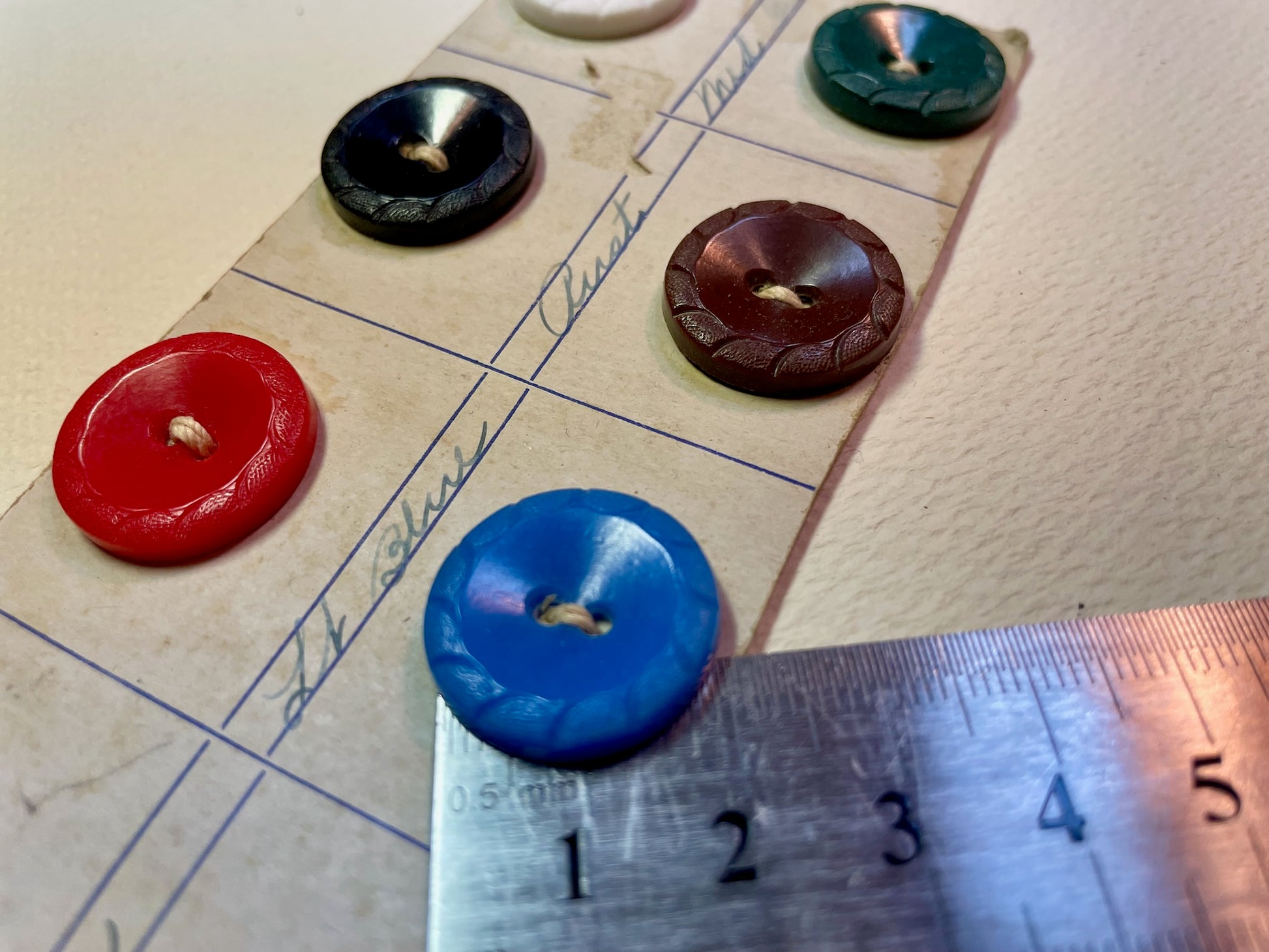 Additional Notes: Partial sample card with handwritten color descriptions. A seventh button (as pictured) is smaller at 13.5 mm
