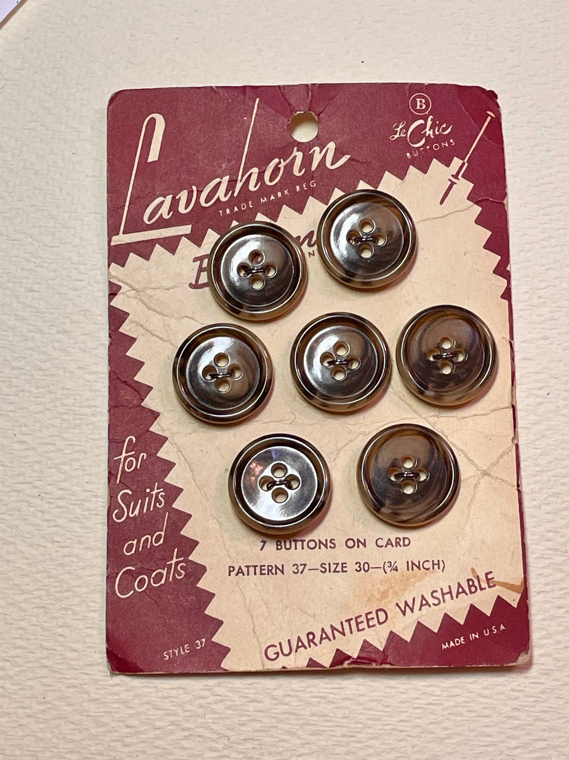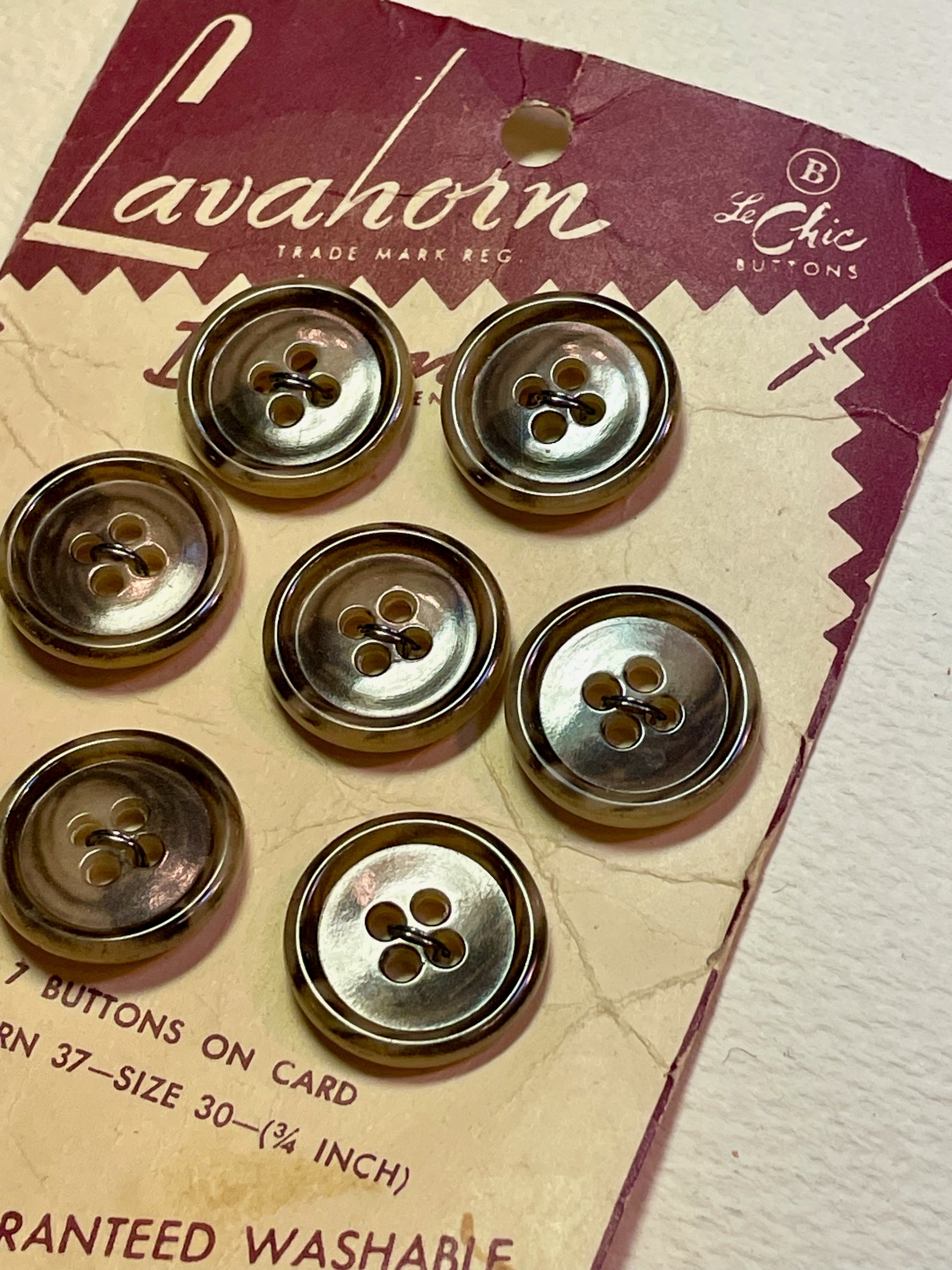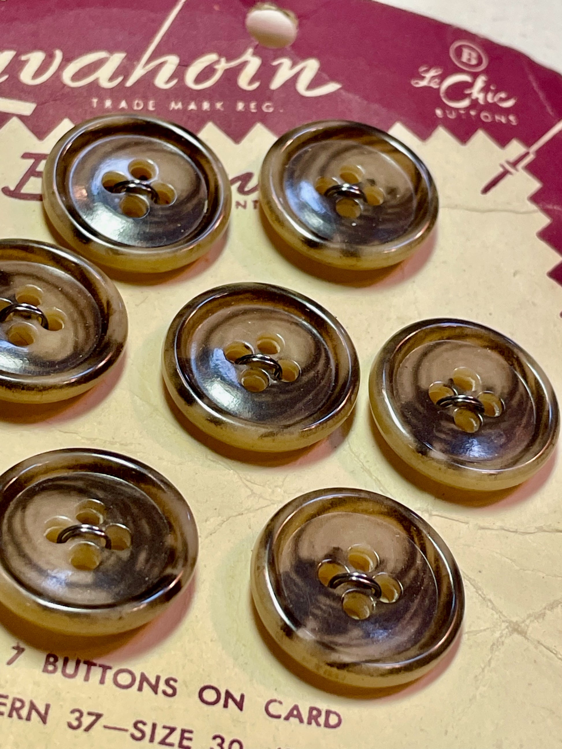 7 brown 1960s vtg Lavahorn faux horn buttons | 4 hole flat | size 30/0.75" | new old stock | made in USA