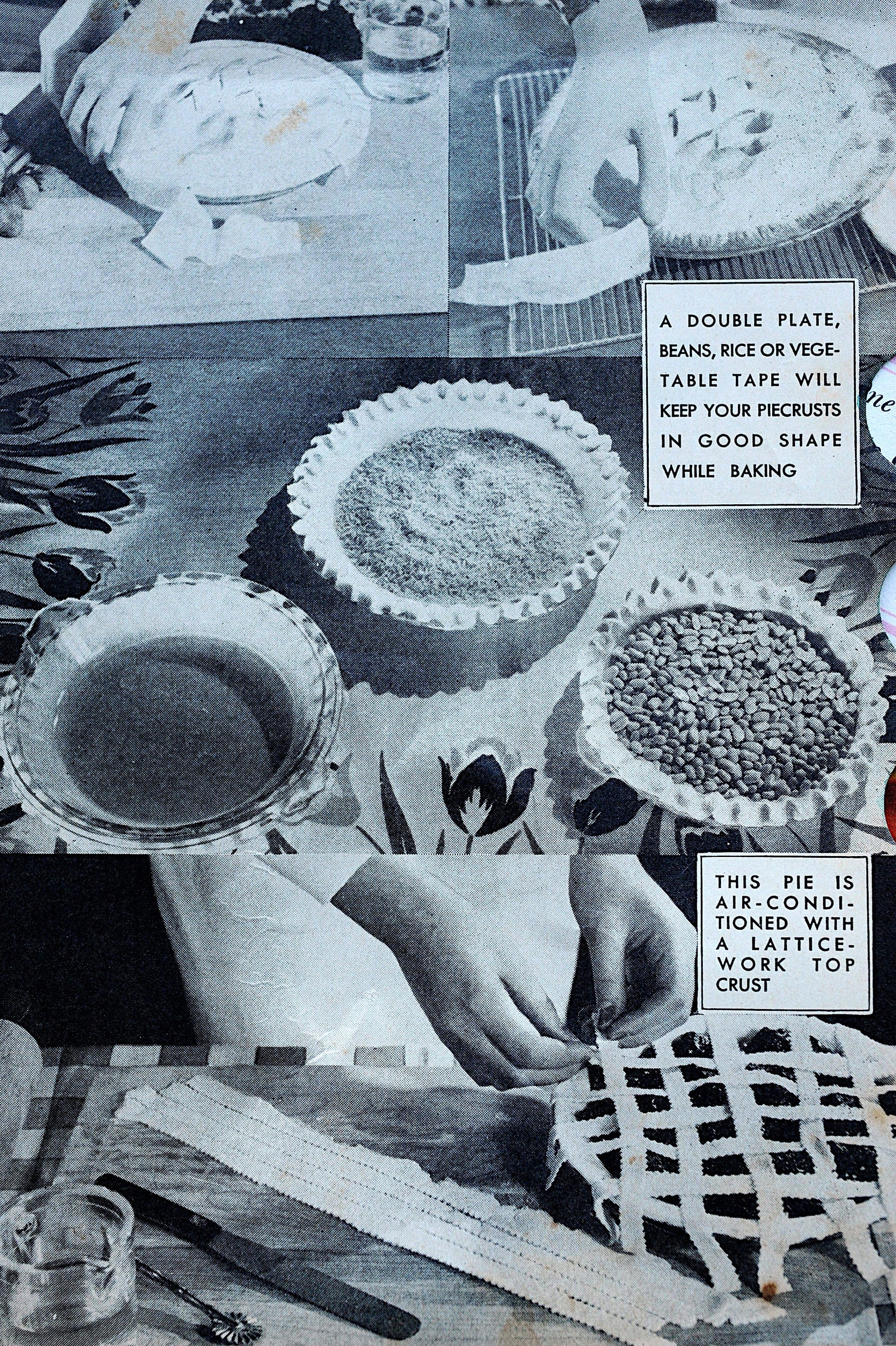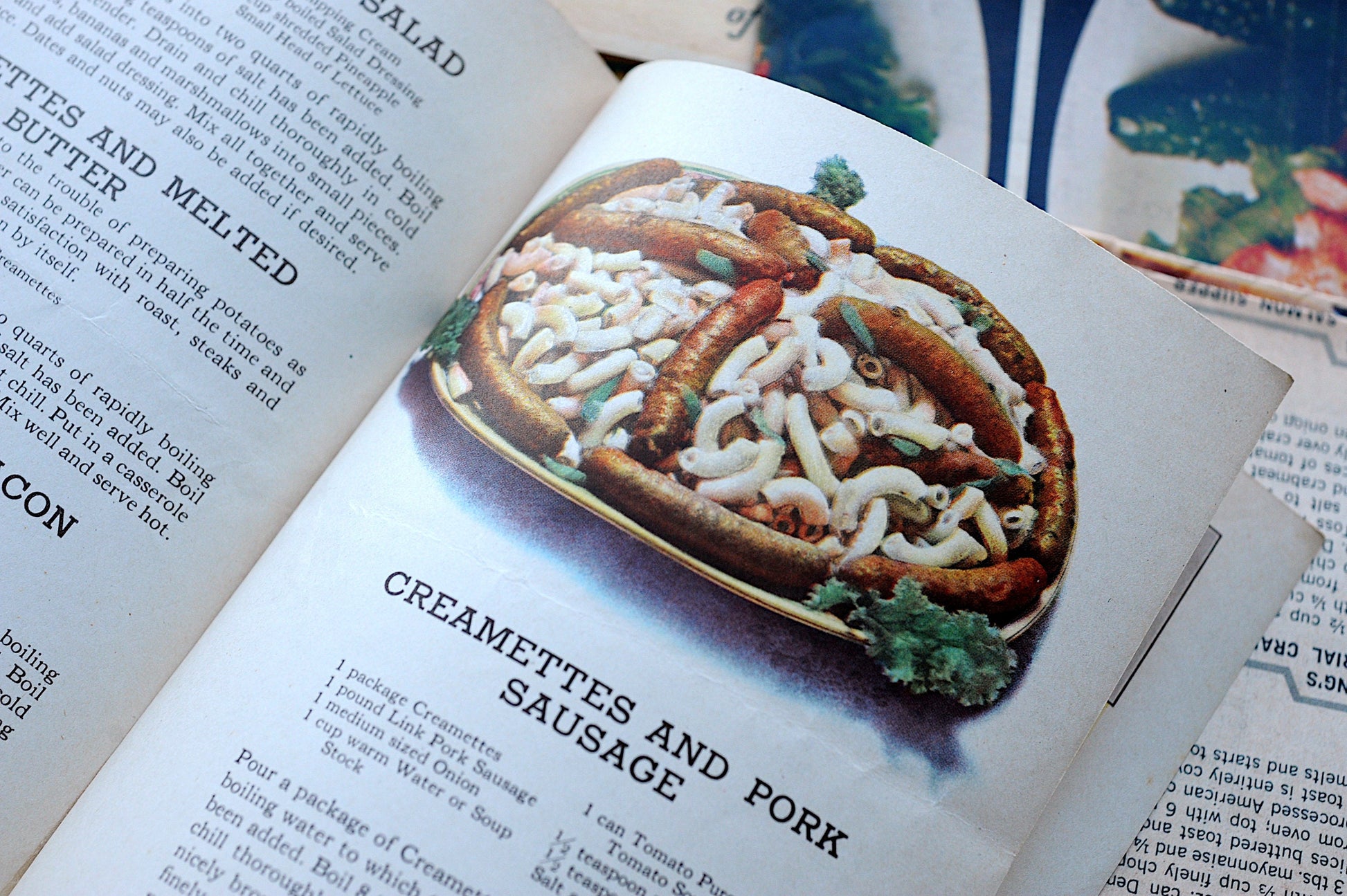 1/8 lb mix of kitschy photo & illustration pages from cookbooks, newspapers, magazines, etc. - mostly 1950s-70s.