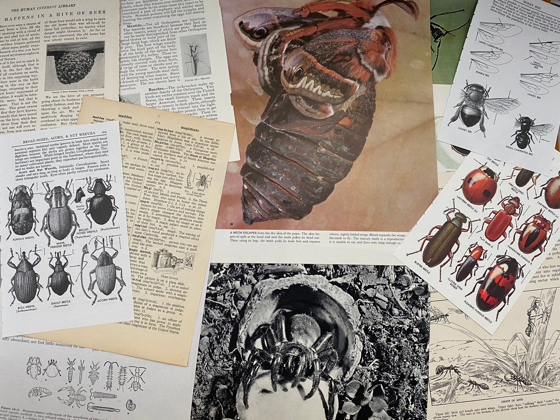 Papers for repurposing: 1/8 lb vtg salvage pages: CREEPY CRAWLIES (mostly insects)