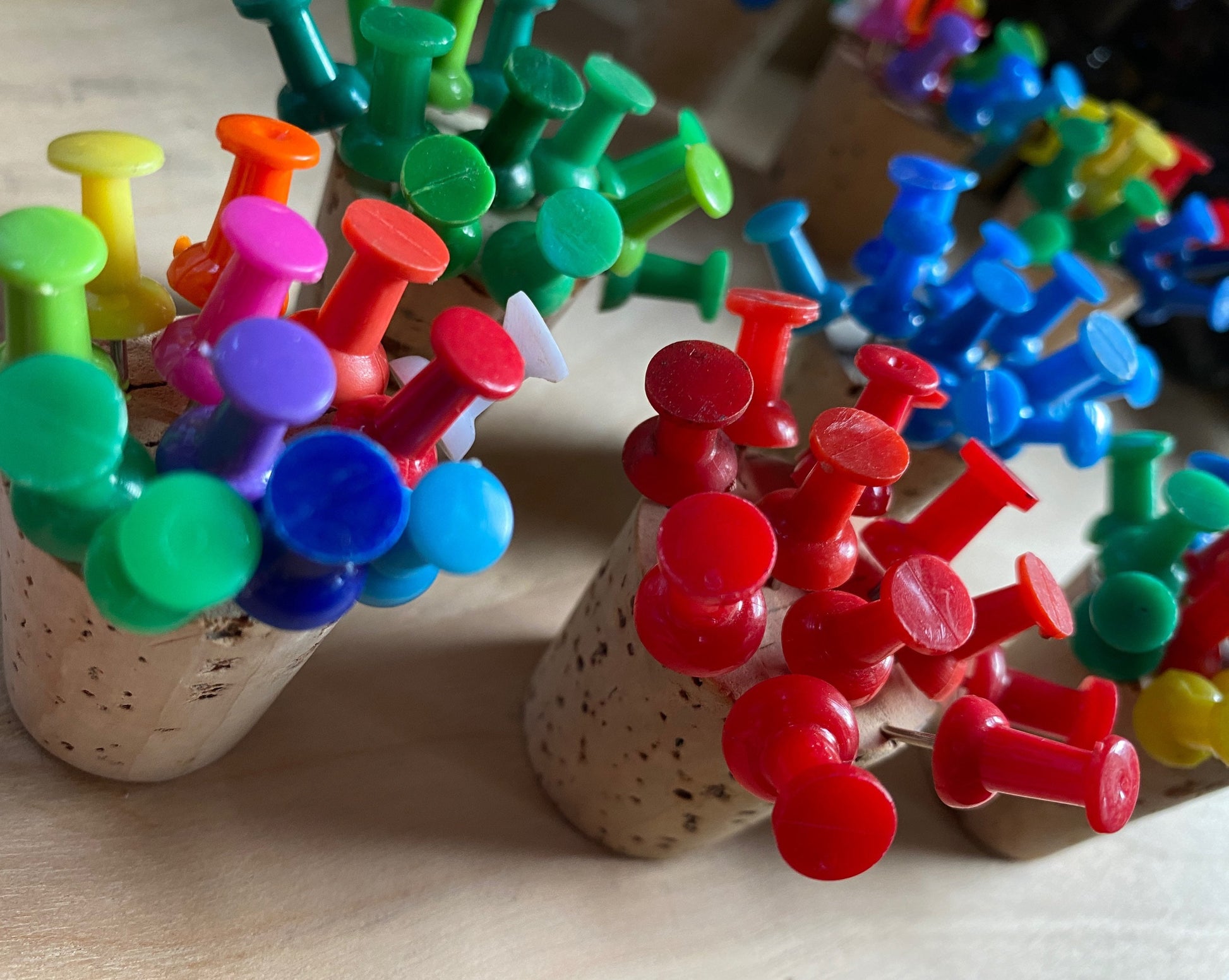 One dozen (12) vintage thumbtacks / VTG office supplies, metal and/or plastic tacks, map pins pushpins