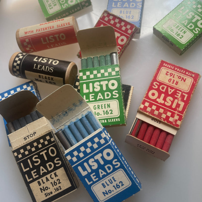 Six grease pencil (china marker) leads and one metal sheath per container. New old stock, manufactured for use with the classic twist-style Listo Marking Pencil #1620 (sold separately).