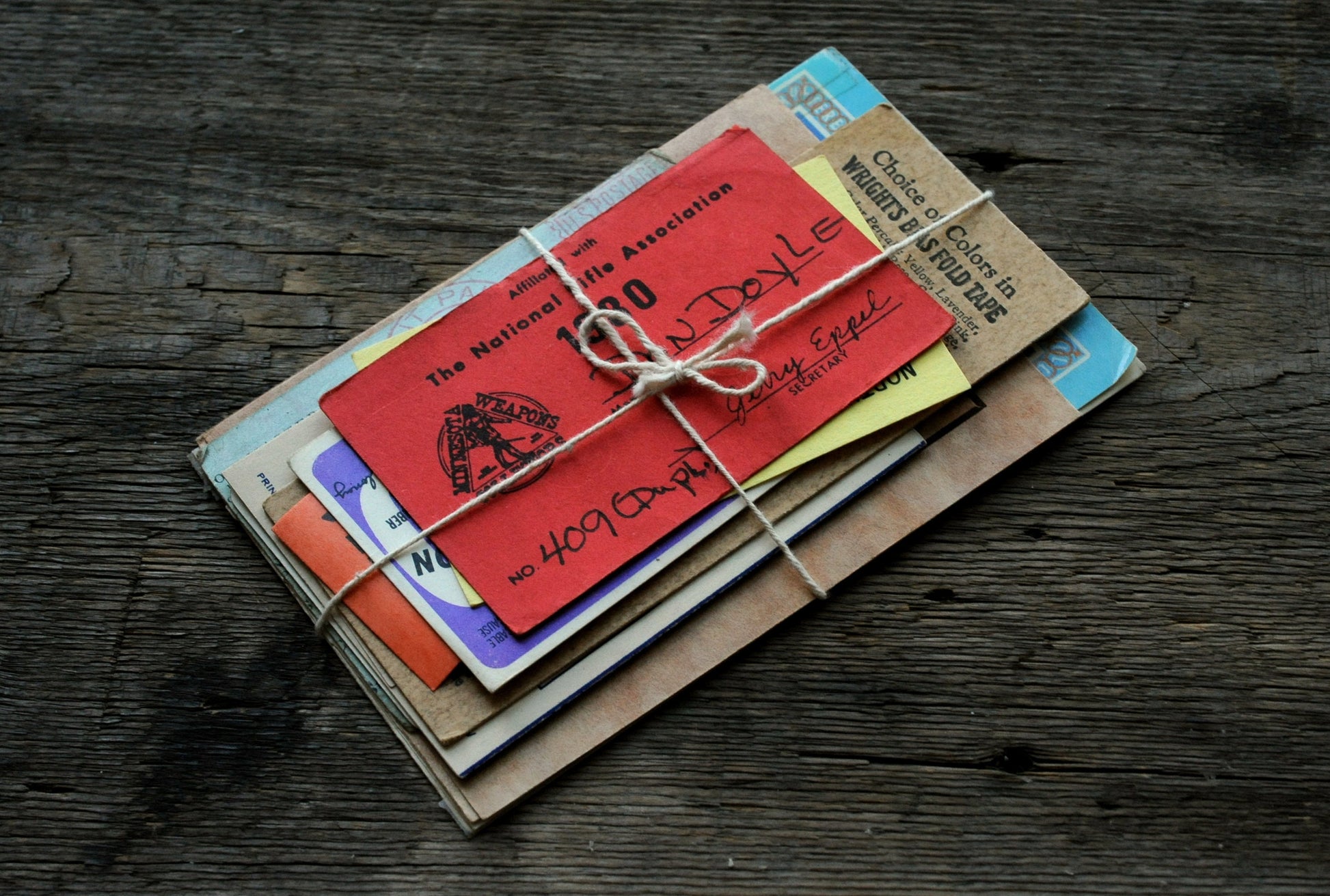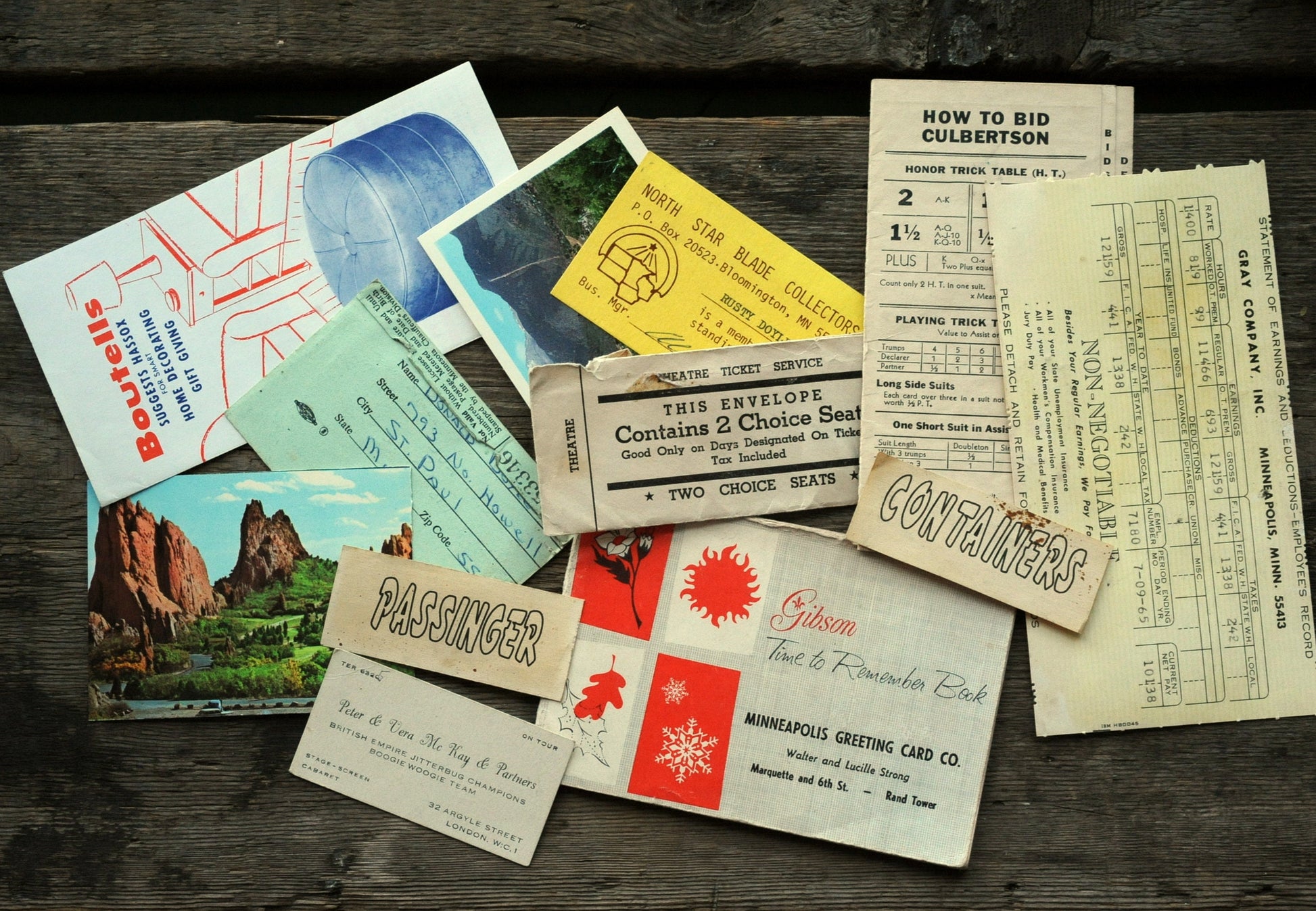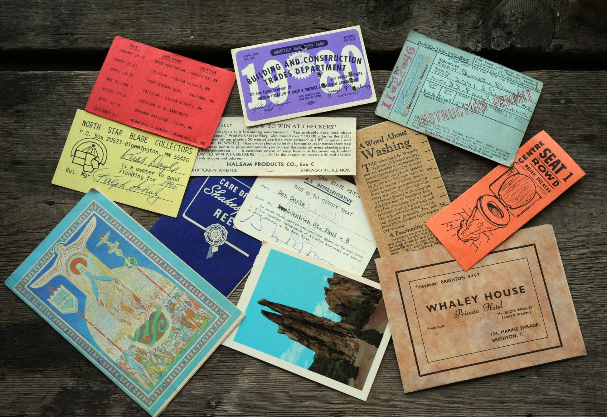 20 small pieces for scrapbooking, paper crafts, junk journal, collage, mixed media: IDs, business cards, pamphlets, ticket stubs, etc. Expect 1940s-1970s. Photos are representative; product is one of a kind: each assortment will vary.