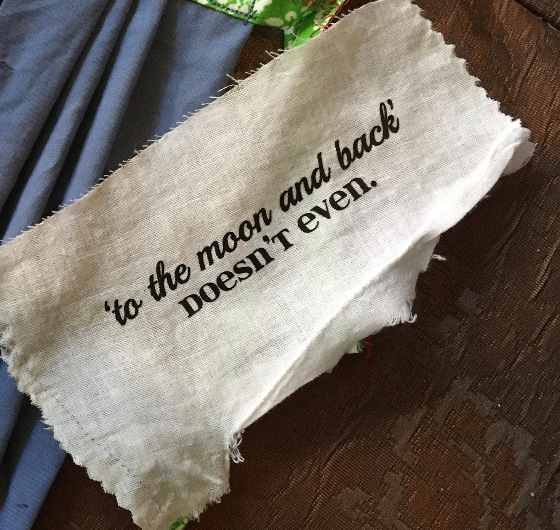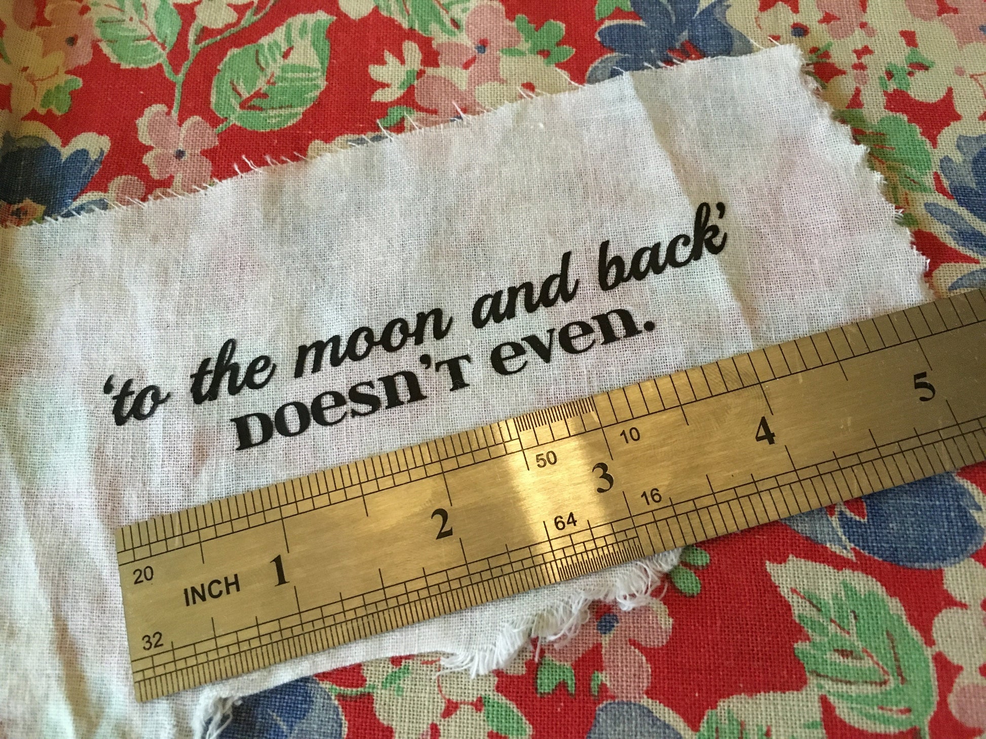 To The Moon & Back Doesn't Even: patch printed on rescued fabric scrap (for visible mending, gift making, embellishment, repair)