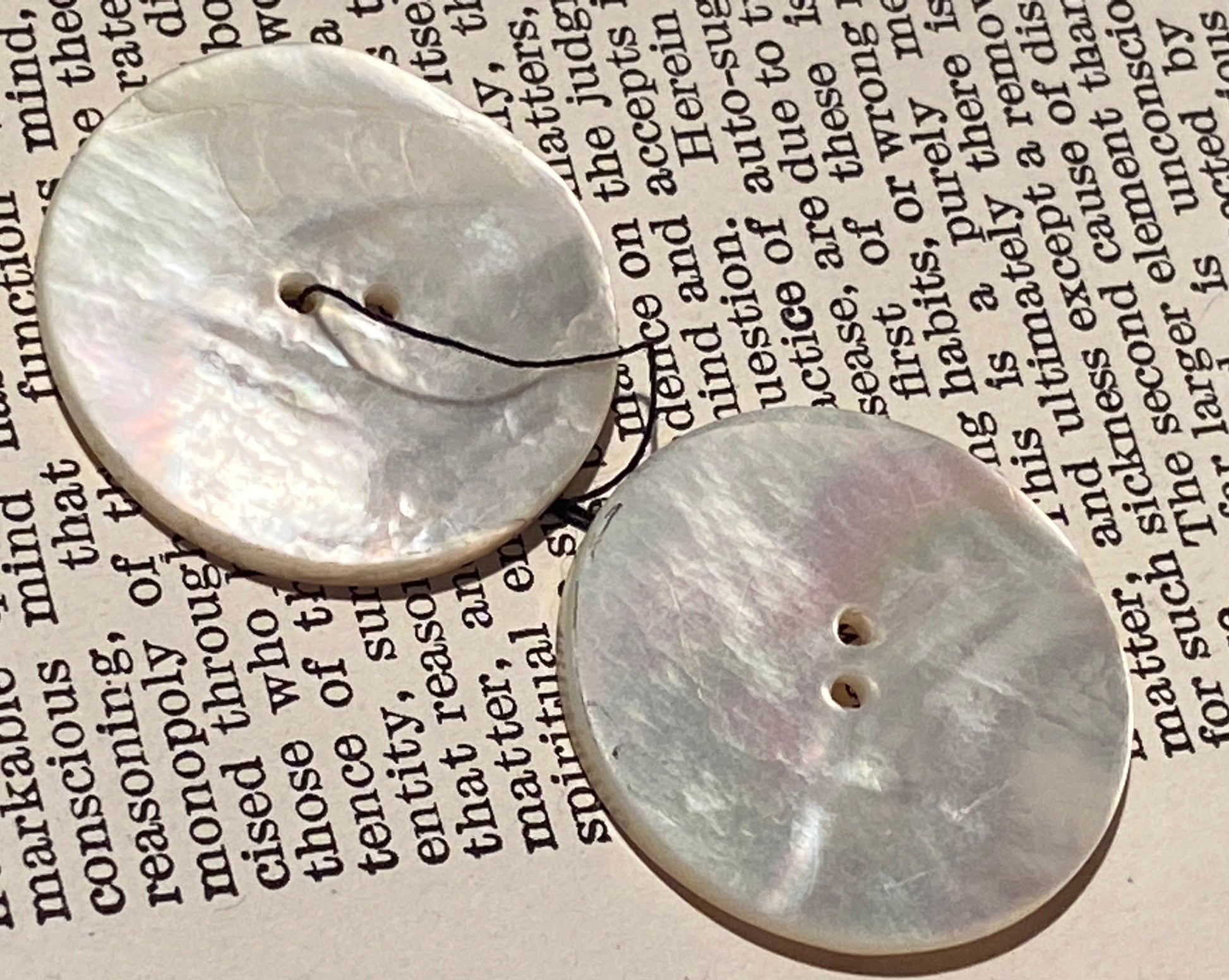 2 vtg matched abalone shell buttons: 1.125" hand carved, raised relief cat eye
