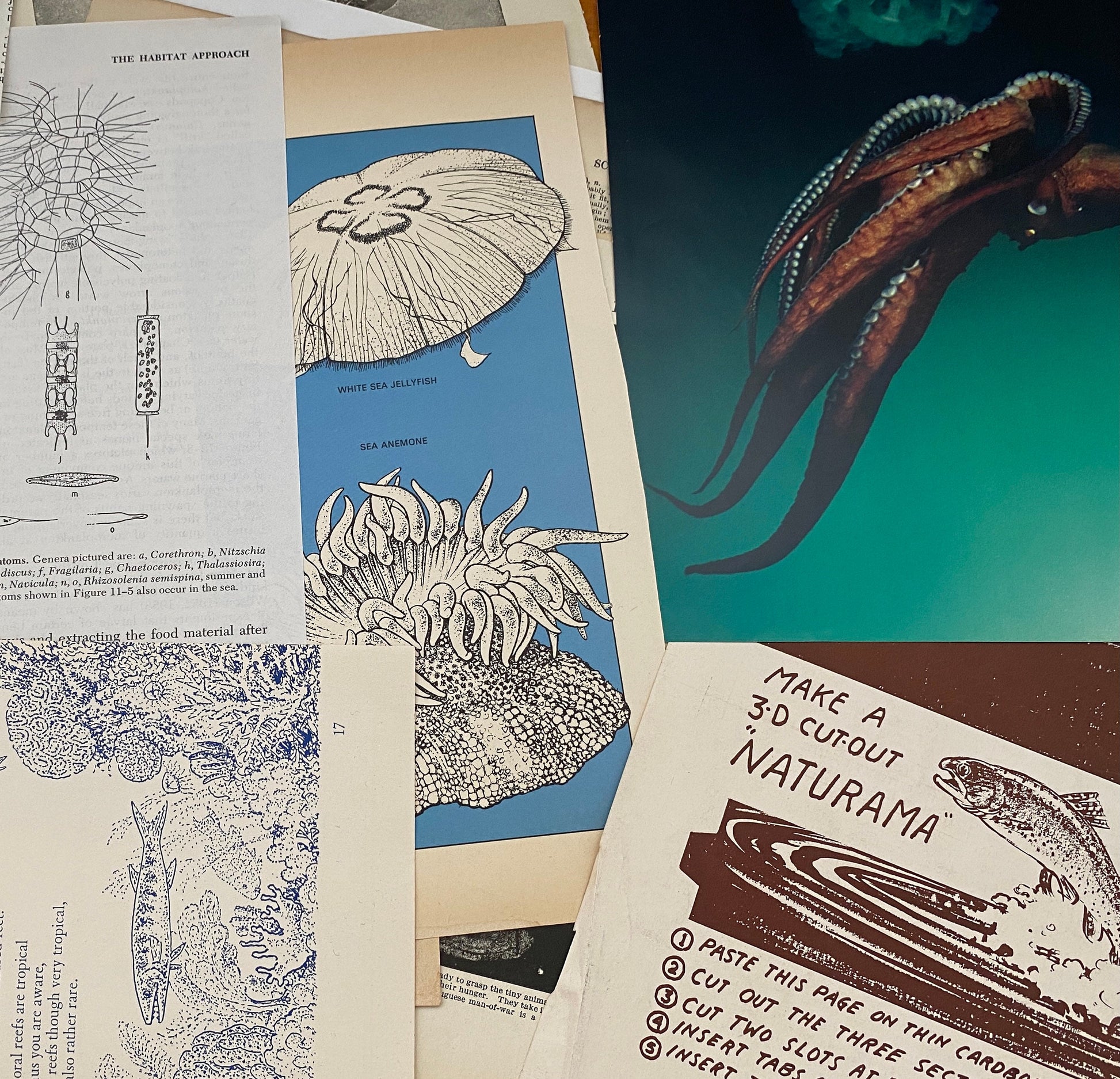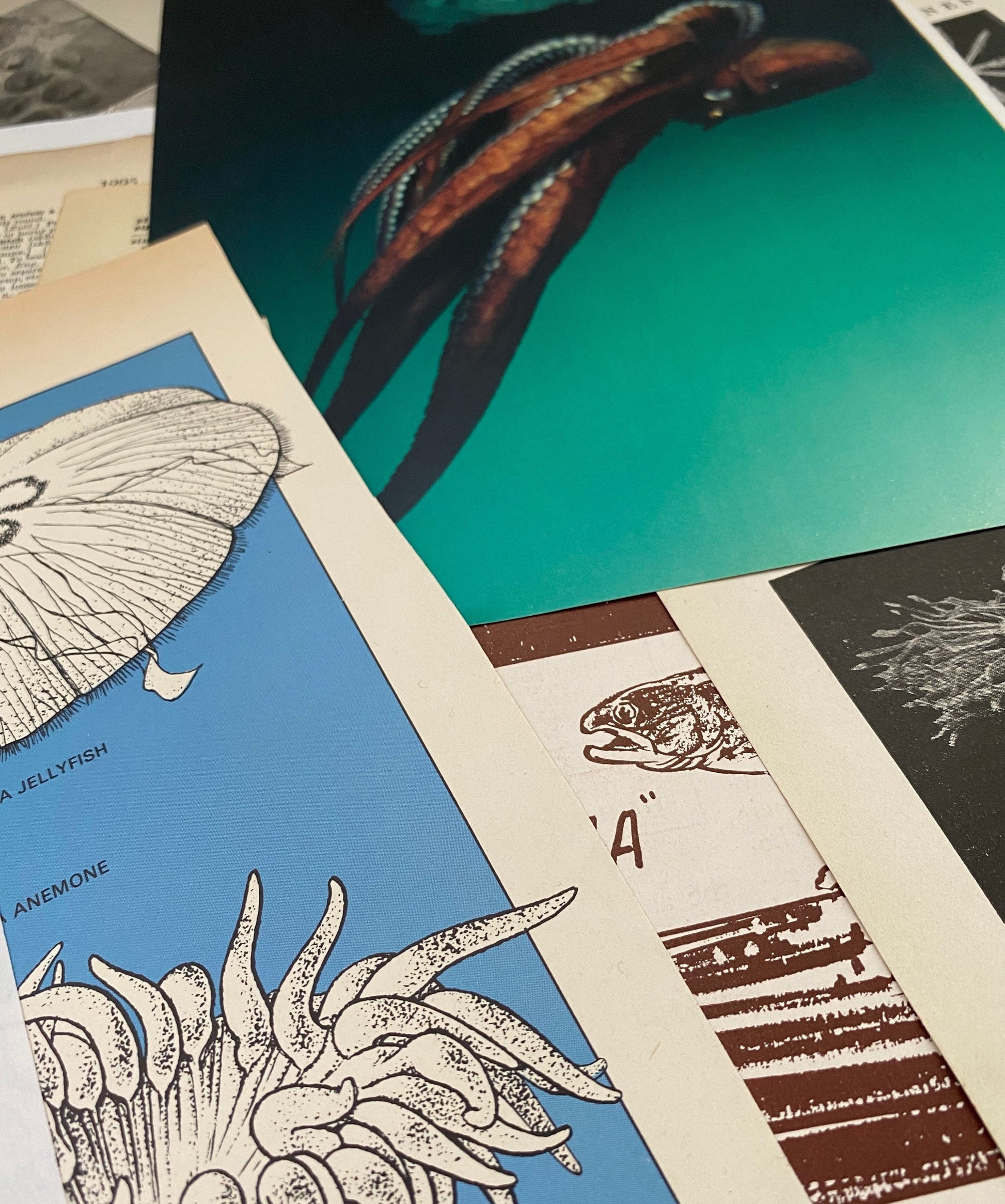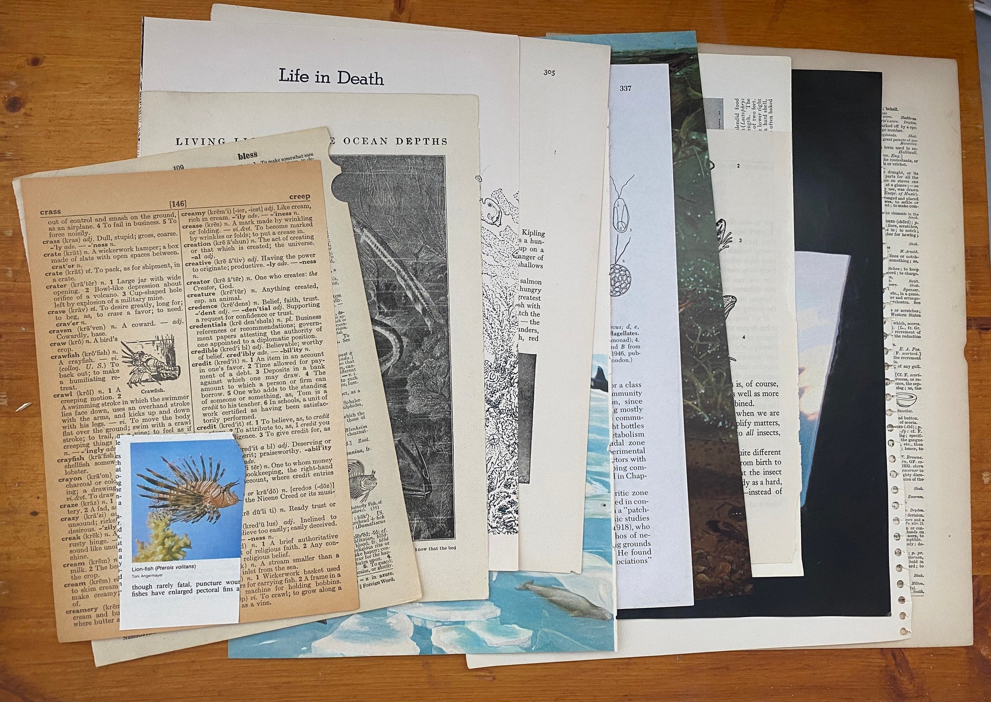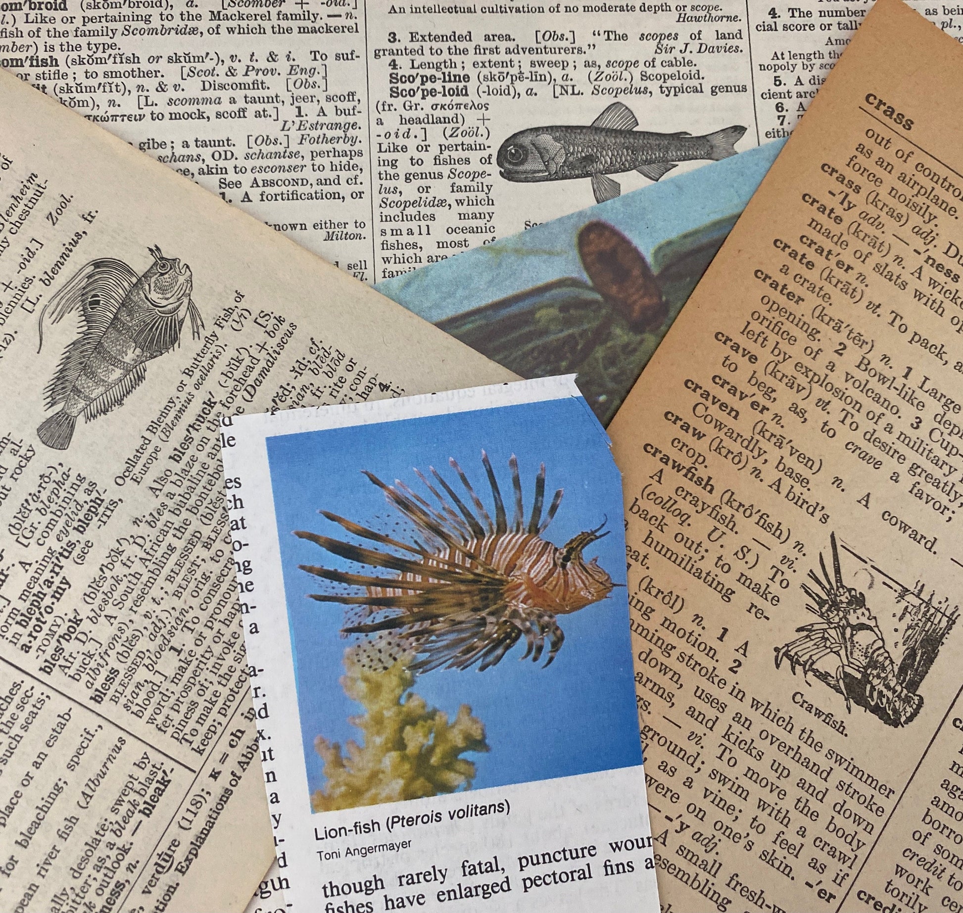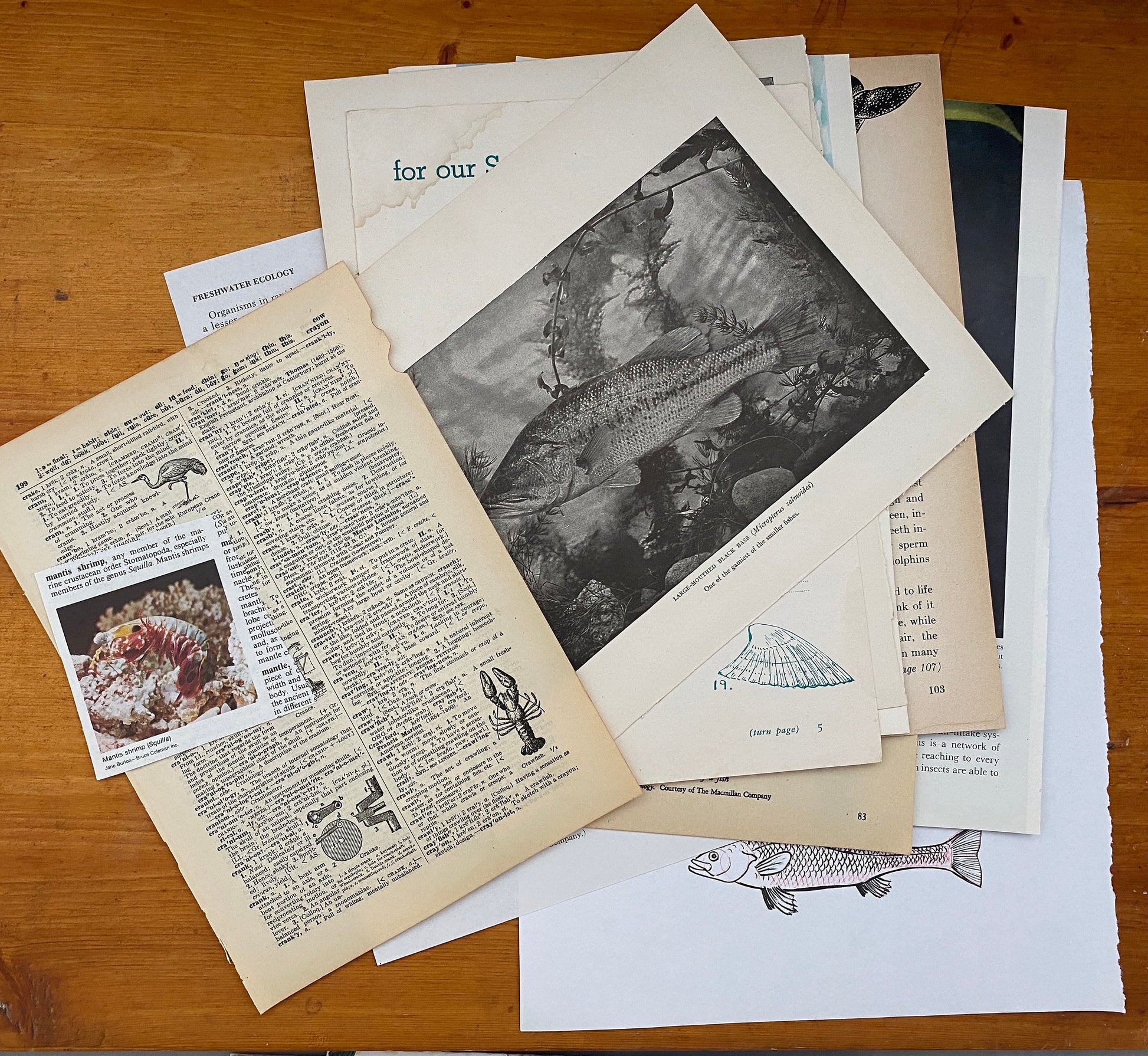UNDER THE SEA: 1/8 lb mix of vintage fish & related book pages and papers for art, collage, junk journal, scrapbook, craft