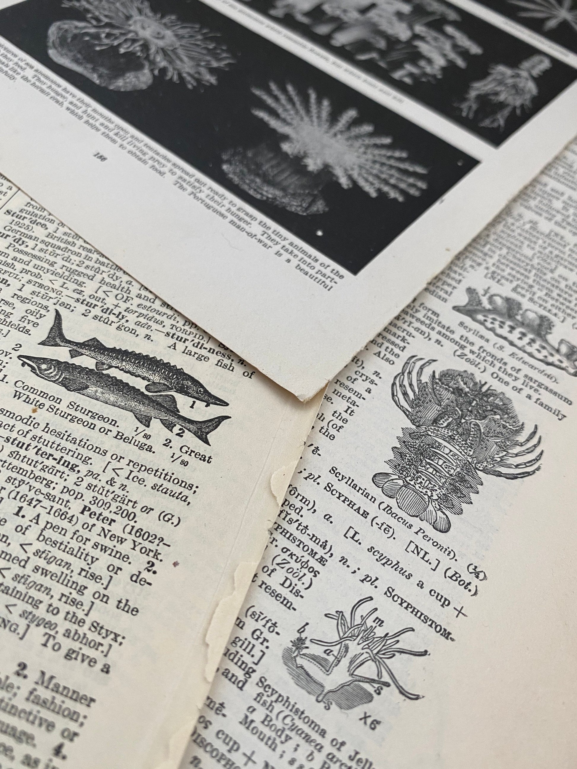 When you choose this item, one of our artists will hand-select 1/8 pound of vintage book pages featuring sea life: fish & critters found living beneath the water’s surface – perfect for collage art, junk journals, and scrapbooking. Expect illustrations & photos from 20th century publications. 50s-70s feature prominently. Page count is estimated at roughly 10-12 but may vary due to page size and paper weight.