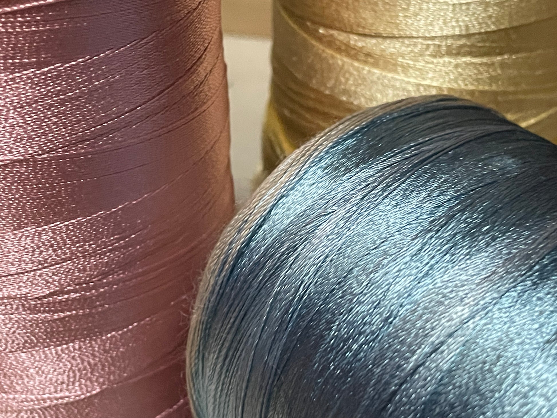 5 yards each bundle of vintage silk embroidery thread in pink, yellow, and blue