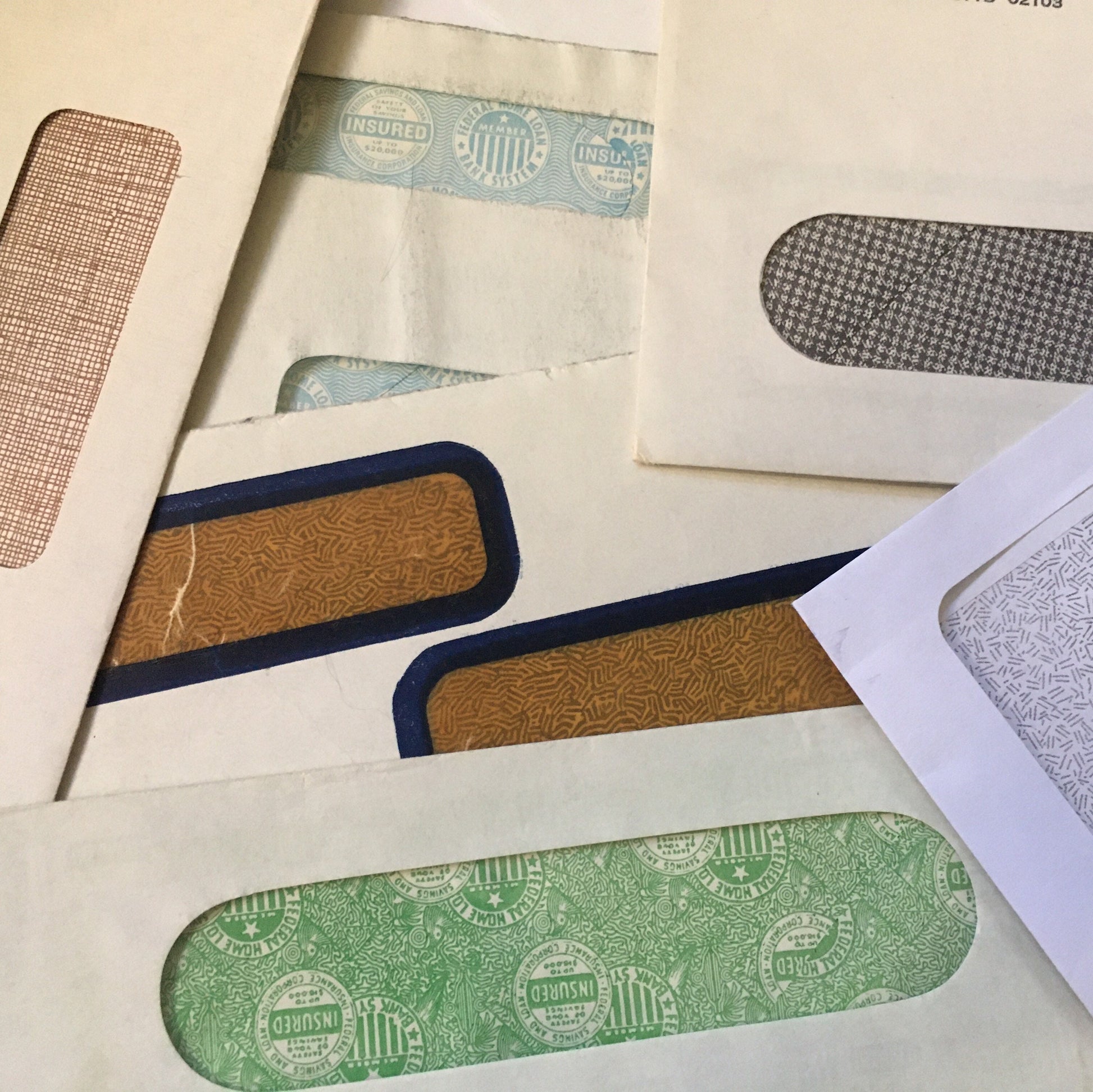 Ten (10) gram assortment of vintage to modern security envelopes & parts for re-purposing, DIY, book arts, ephemera pieces