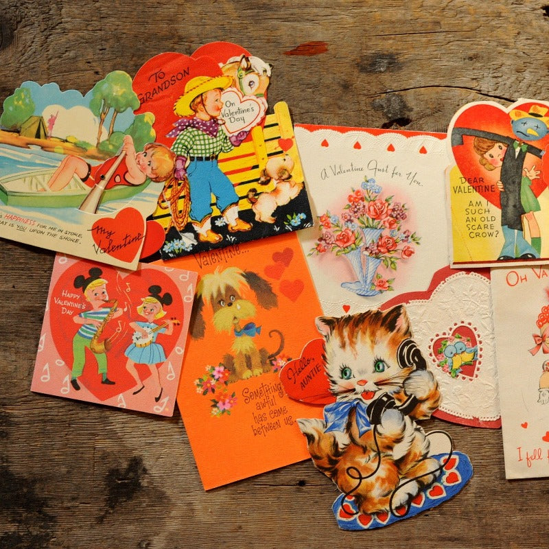 Assortment of 8 classic valentine cards from the 1940s, 1950s, 1960s. Most, if not all will have writing and other evidence of wear. Some cards offer more general greetings, and others are specific, ie. "Happy Valentines Day to my wife/grandson/niece, etc. The valentines pictured are representative of our assortment - actual items received will vary.