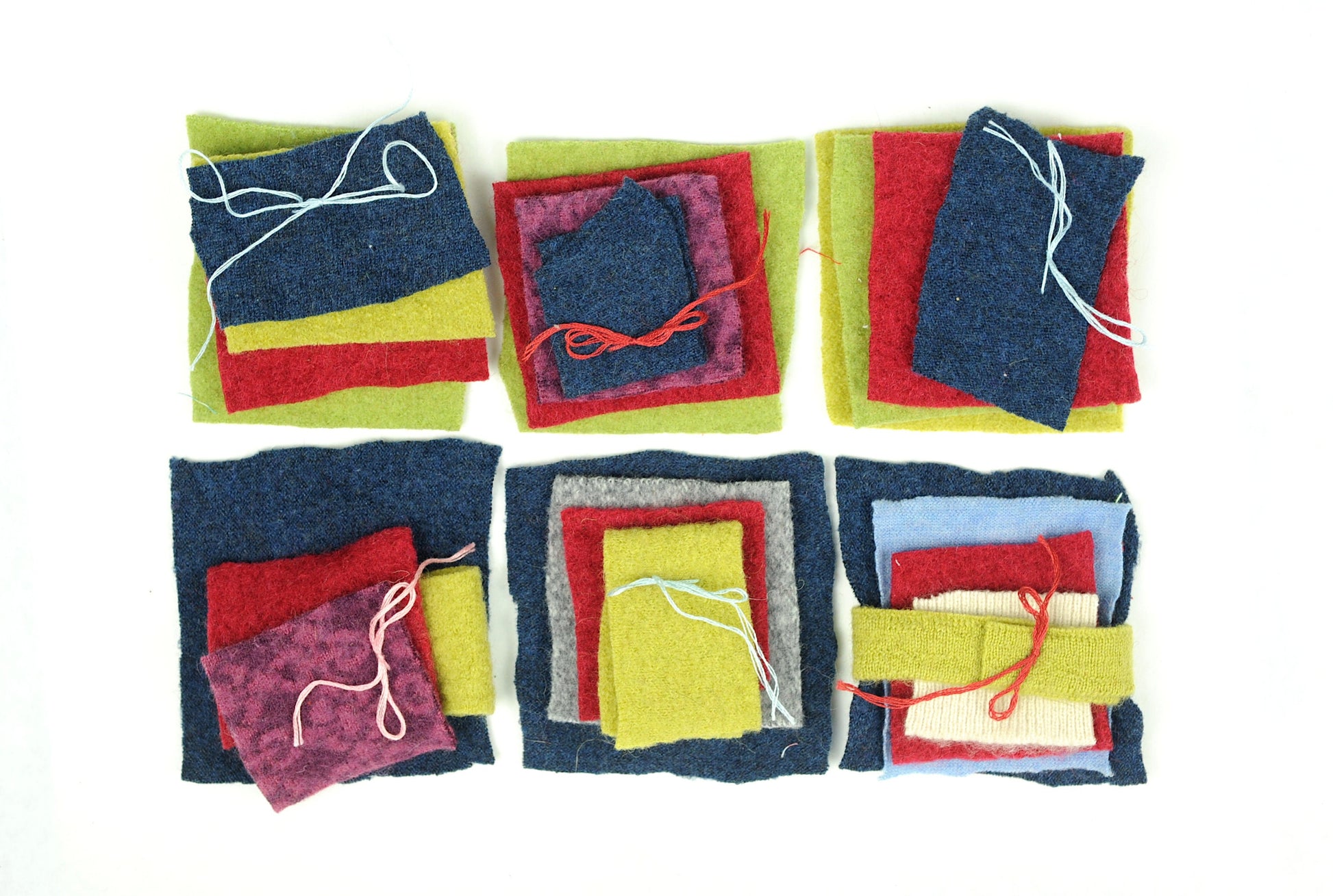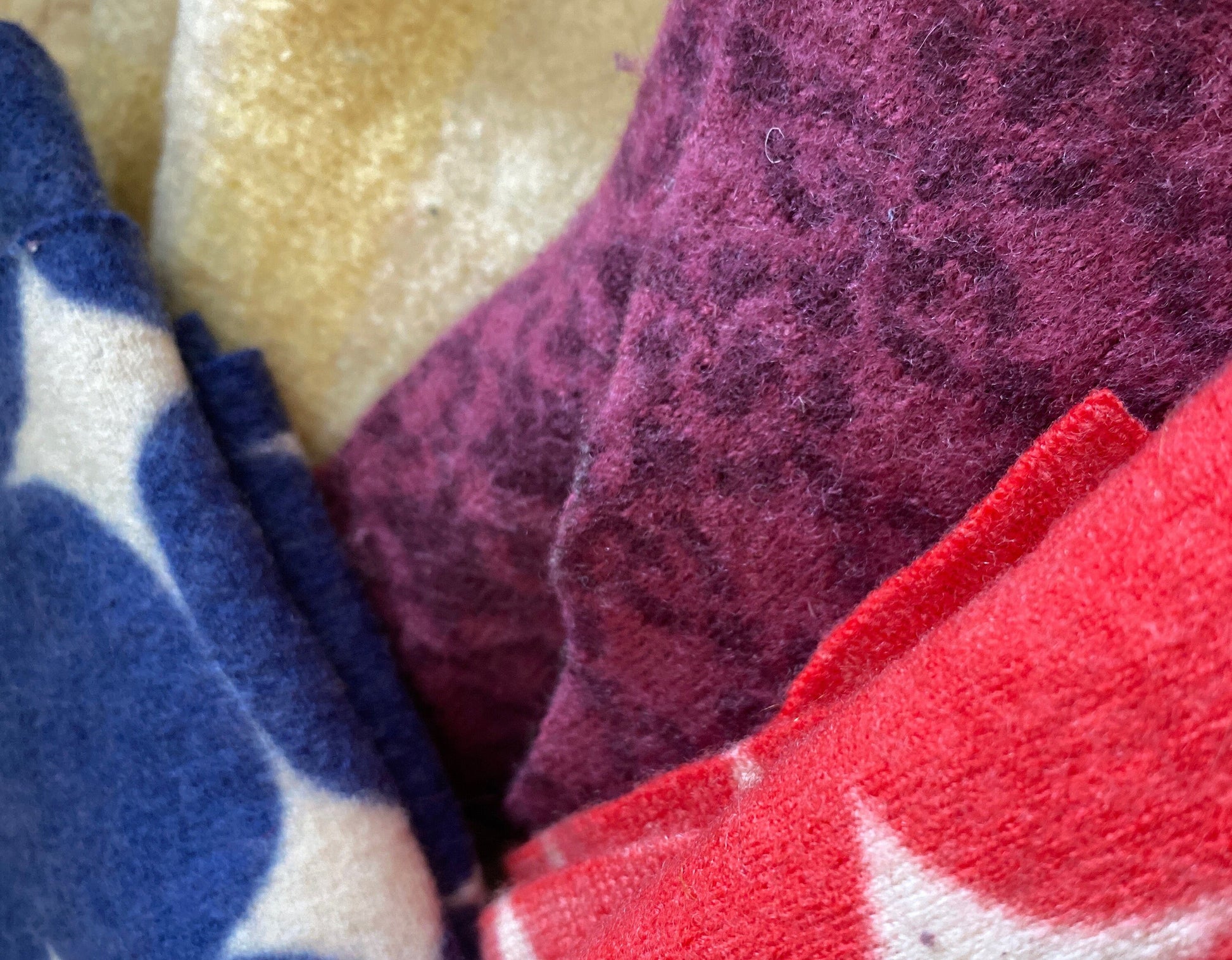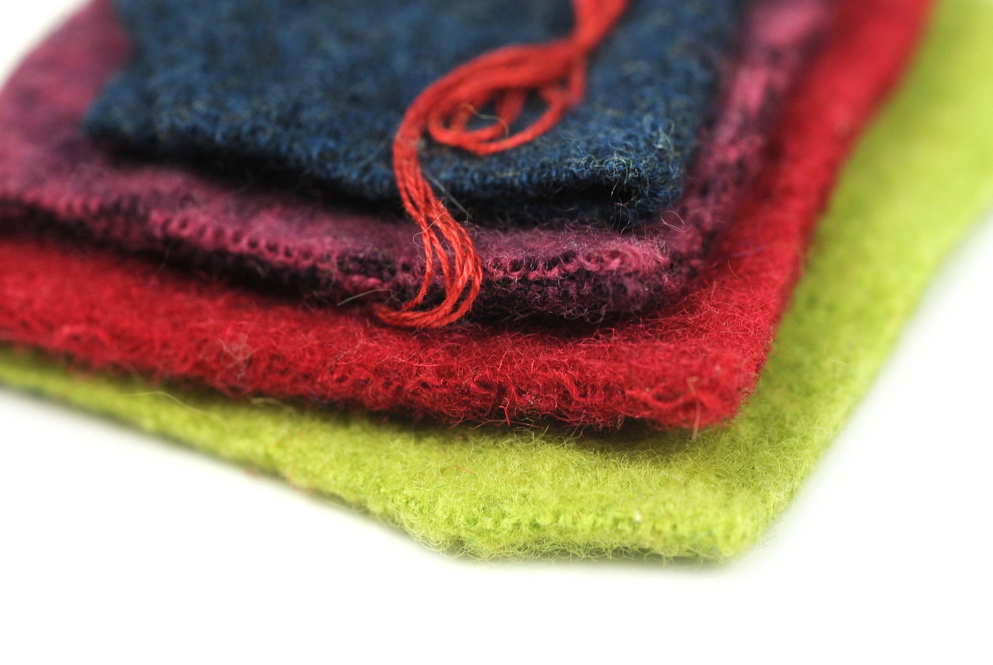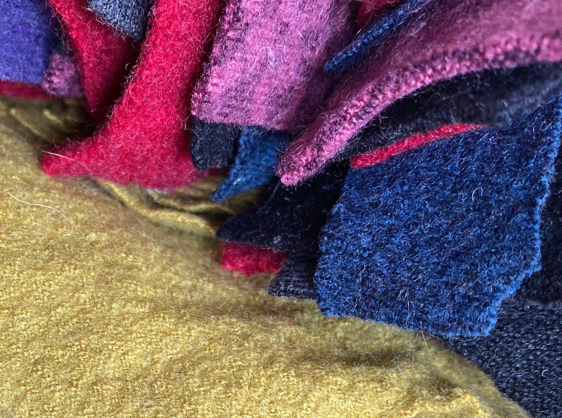 When you purchase this item, you'll receive four secondhand-sourced, felted wool patches in colors similar to those shown. Size of felted wool swatches ranges from 2” inches square to 16” square, and will tally at least 10 grams (about 1/3 oz).